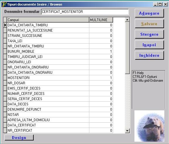 In functie de necesitati, aplicatia dispune si de un modul de creare formulare. Utilizatorul isi creaza tipuri de documente cu campurile necesare, incarca pentru fiecare document matrita, insereaza campurile in locurile in care trebuie completate, salveaza, iar la adaugarea unui formular nou, alege tipul de document, completeaza datele, iar apoi apasa pe un buton si se listeaza raportul. Pentru documentele ca certificat de mostenitor, la care nu se stie numarul de mostenitori (deci nu se stie cate randuri vor fi), se defineste un singur camp, de exemplu Mostenitori, iar pe coloana Multilinie se trece valoarea "1", ceea ce inseamna ca in acel camp se pot completa multe date, pe mai multe randuri; acestea apar in raport asa cum le completeaza utilizatorul, indiferent de lungimea lor. Aplicatia MD permite copierea unui singur fisier de pe calculatorul pe care este instalata pe un laptop si toate datele sunt disponibile imediat si pe laptop. Cu aplicatia MD nu mai este nevoie sa cautati documentele prin fisete si dosare. |