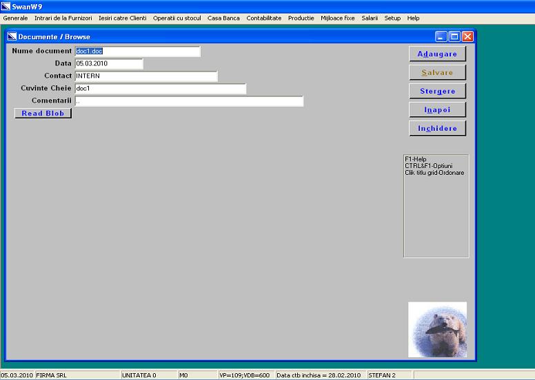 Swan - Management de Documente MD permite memorarea in baza de date a fisierelor de tip jpg, bmp, pdf, doc, txt, rtf si regasirea cu usurinta a acestora. Aplicatia este un important auxiliar pentru firme mari care gestioneaza multe documente. De exemplu: contractele firmei cu terti pot fi scanate si se obtin fisiere jpg sau bmp si printr-un click pot fi memorate in legatura cu terta persoana fizica/juridica; se memoreaza numarul documentului, data documentului si cuvinte cheie. Documentul se poate regasi apoi usor cautand dupa nume terti, nume document, data, interval de timp sau dupa cuvinte cheie. In cazul in care contractul este de tip document word(.doc) sau .txt sau .pdf, nu este nevoie sa fie scanat, poate fi memorat ca atare. Aplicatia are un sistem de securitate pe grupuri si utilizatori cu parole si drepturi pe fiecare utilizator in parte, asa incat un utilizator poate deschide decat documentul la care are dreptul.